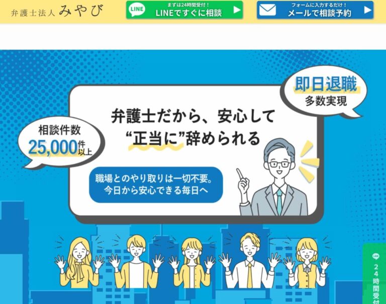 早くこの会社から解放されたい、新しい仕事に転職して充実した毎日を過ごしたいなら、24時間いつでも無料相談できる弁護士法人みやびがオススメです。